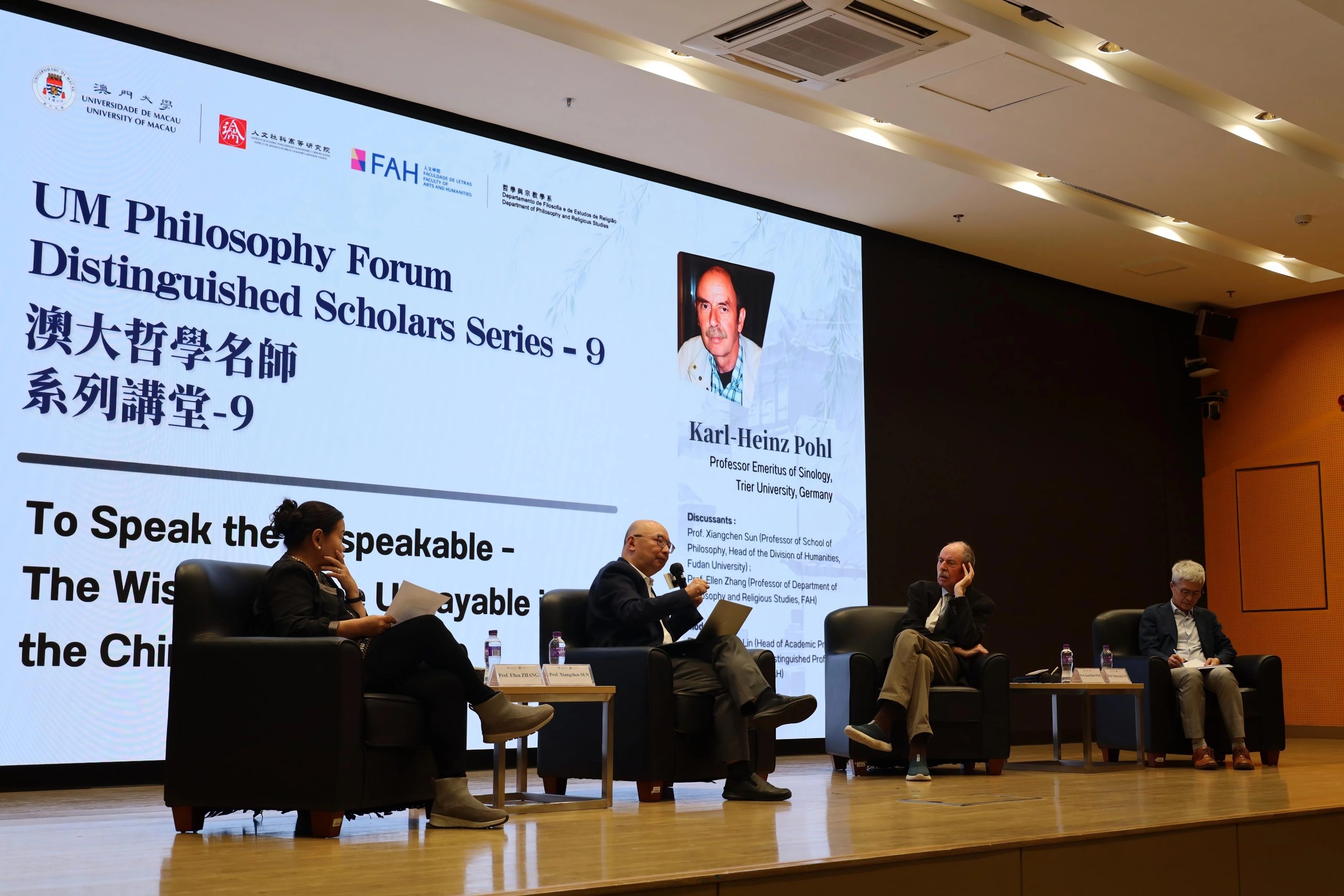 The UM Philosophy Forum Distinguished Scholars Series 9, co-organised by the Institute of Advanced Studies in Humanities and Social Sciences (IAS) and the Department of Philosophy and Religious Studies of the Faculty of Arts and Humanities (FAH), was successfully held on 27 October 2025 at the Library Auditorium (E2-G012), University of Macau. Professor Karl-Heinz Pohl, Professor Emeritus of Sinology at Trier University, Germany, delivered a thought-provoking lecture titled “To Speak the Unspeakable – The Wisdom of the Unsayable in the Chinese Tradition.” “Professor Xiangchen Sun, Professor of the School of Philosophy and Head of the Division of Humanities at Fudan University, and Professor Ellen Zhang, Professor in the Department of Philosophy and Religious Studies at the Faculty of Arts and Humanities, served as discussants. Meanwhile, Professor Shaoyang Lin, Head of Academic Programme and Publication at IAS and Distinguished Professor in the Department of History at the Faculty of Arts and Humanities, acted as the moderator.