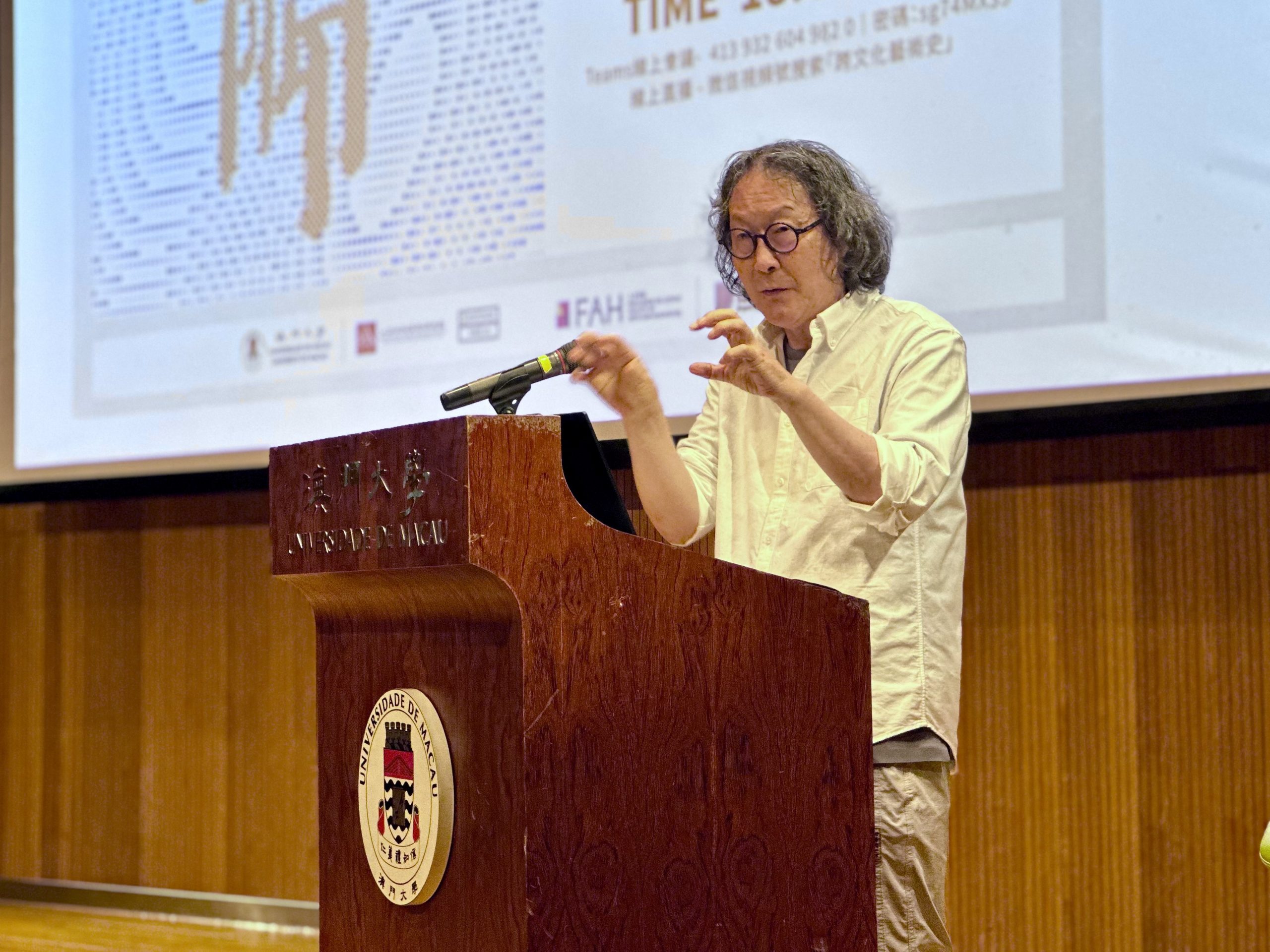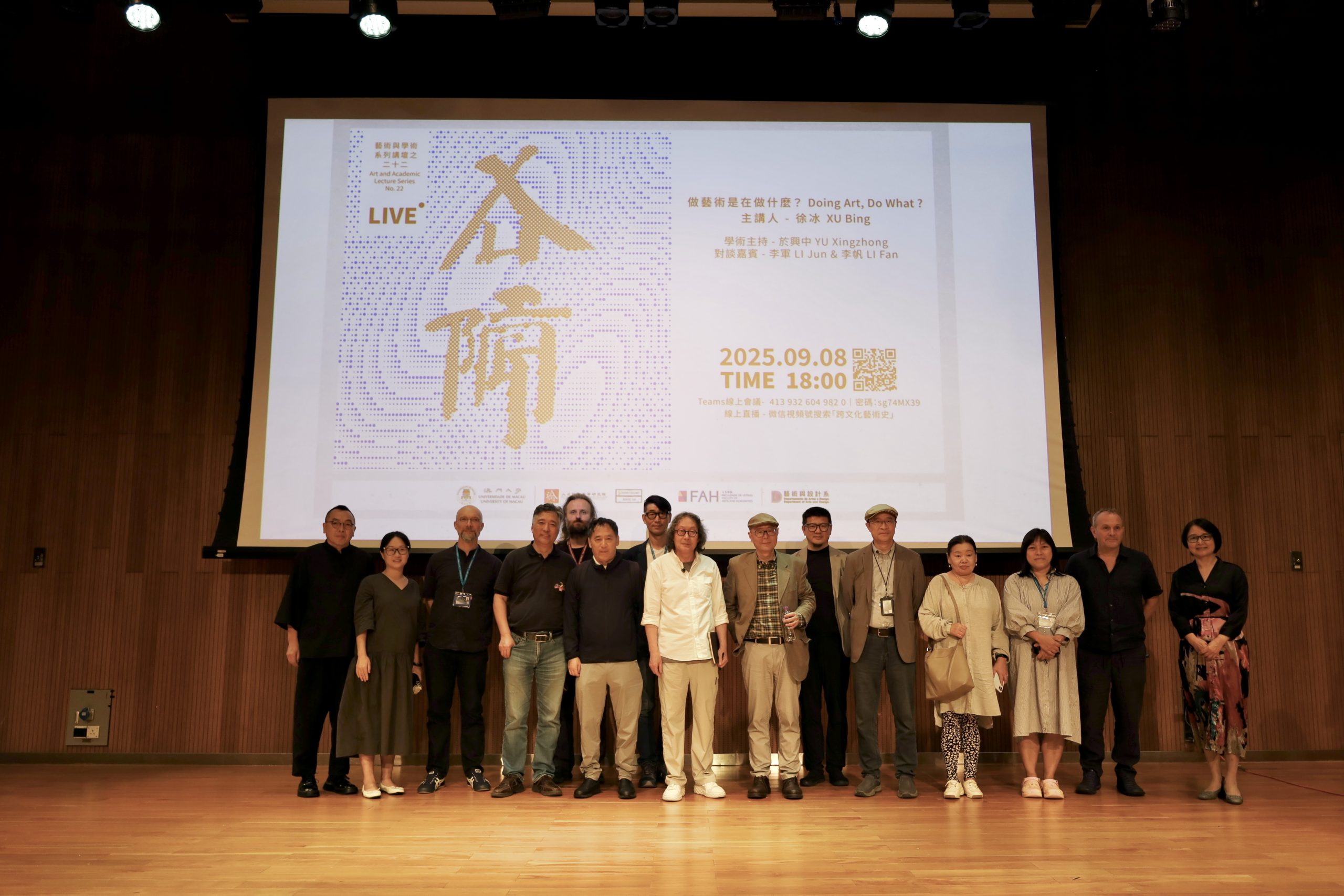 2025年9月8日,澳門大學人文社科高等研究院(高研院)與人文學院藝術與設計系成功合辦主題為“做藝術是在做什麼?”的藝術與學術系列講壇。主講人為中央美術學院教授、著名藝術家徐冰教授。講座以徐冰教授的代表作品為例,深入探討了藝術的本質與功能,以及藝術與文明、社會的關係。本次講座由高研院院長、法學院講座教授於興中教授主持。活動伊始,人文學院藝術與設計系主任、講座教授李軍教授致開幕詞,對嘉賓及與會者表示熱烈歡迎,並對講座主題進行了簡要引介。