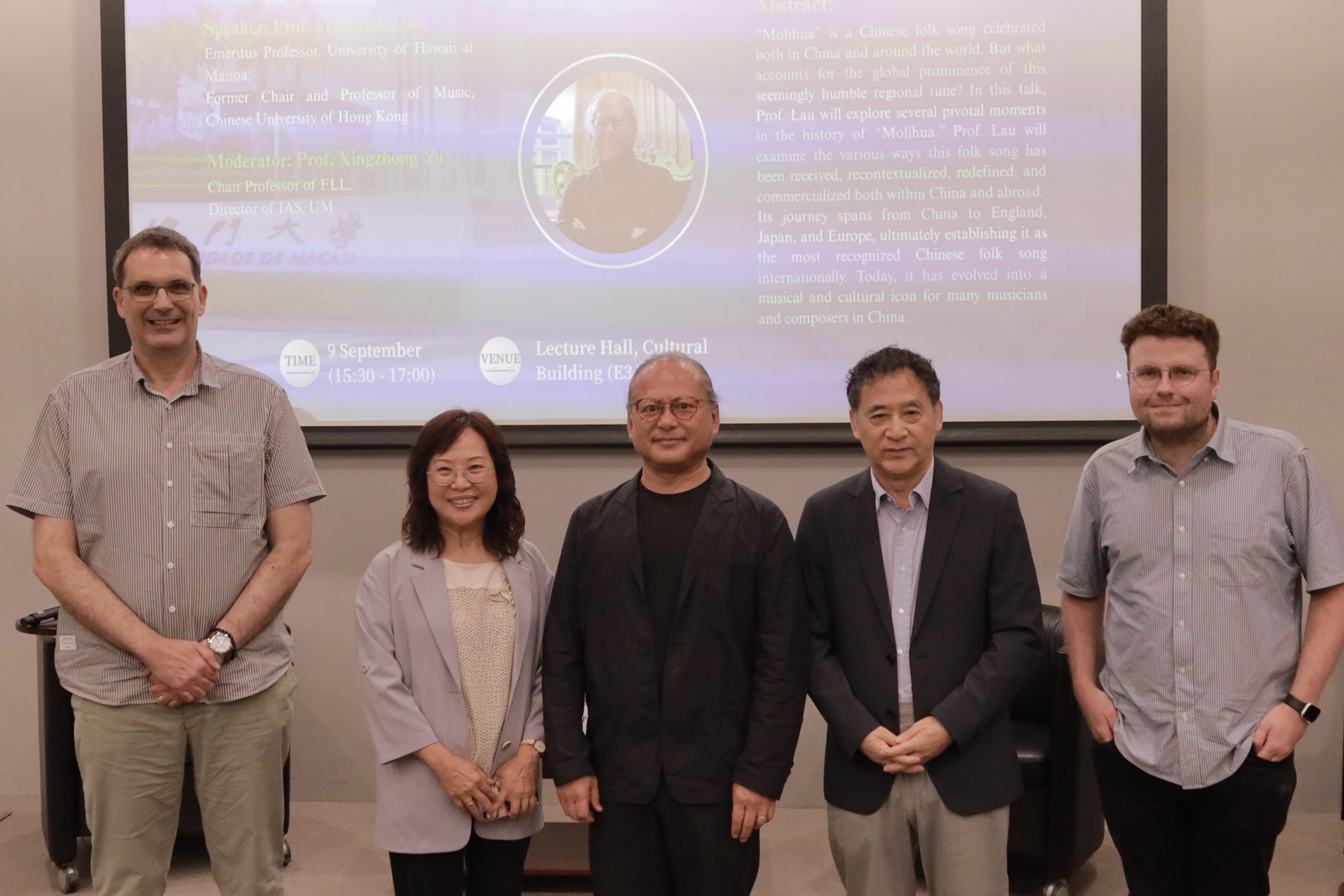 9月9日,澳門大學人文社科高等研究院(高研院)成功舉辦題為”音樂能為中國研究帶來什麼?”。講座由夏威夷大學馬諾阿分校榮休教授、前香港中文大學音樂系主任及教授的劉長江(Frederick Lau)教授主講。高研院院長及法學院講座教授於興中教授指出,這是高研院首次舉辦以音樂為主題的學術活動。