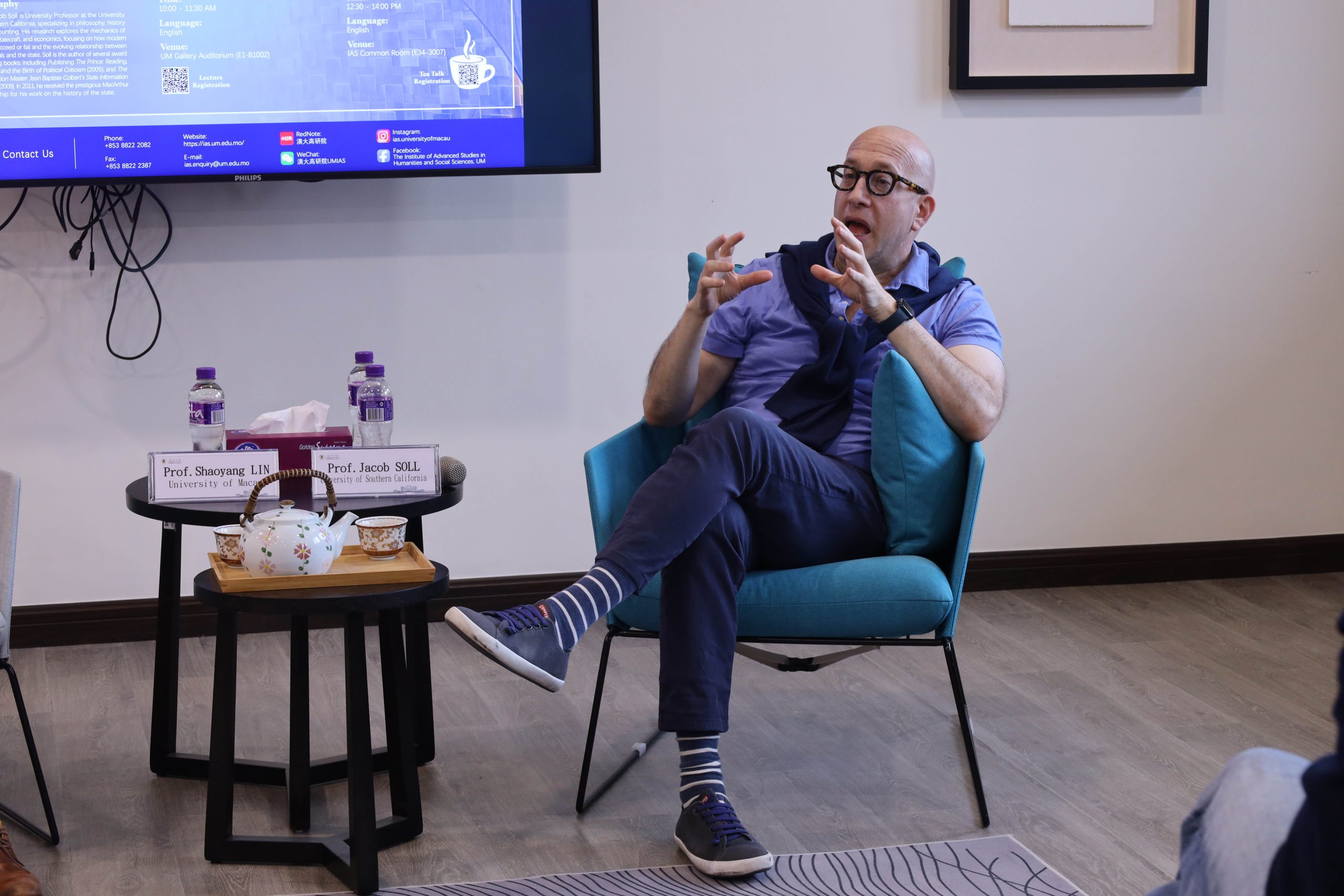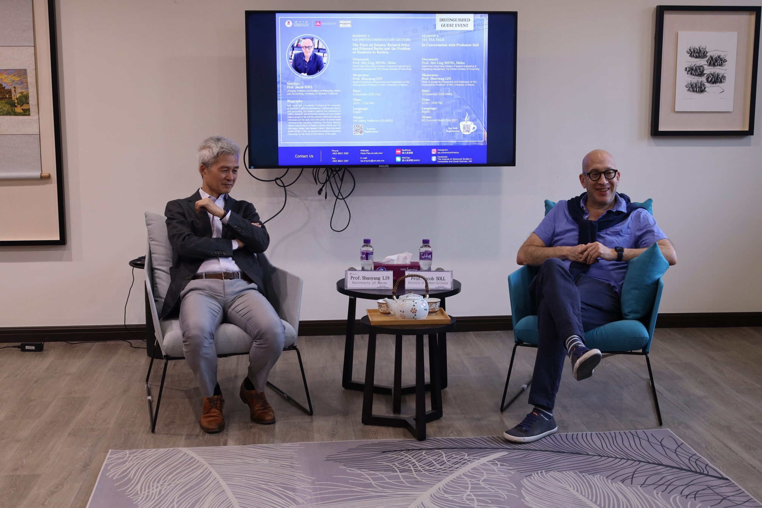 On December 10, the Institute of Advanced Studies in Humanities and Social Sciences (IAS) at University of Macau successfully hosted the tea talk session in conversation with Professor Jacob SOLL, who is a university professor and professor of Philosophy, History and Accounting at University of Southern California. Professor Shaoyang LIN, Head of Academic Programme and Publication of IAS, served as moderator.