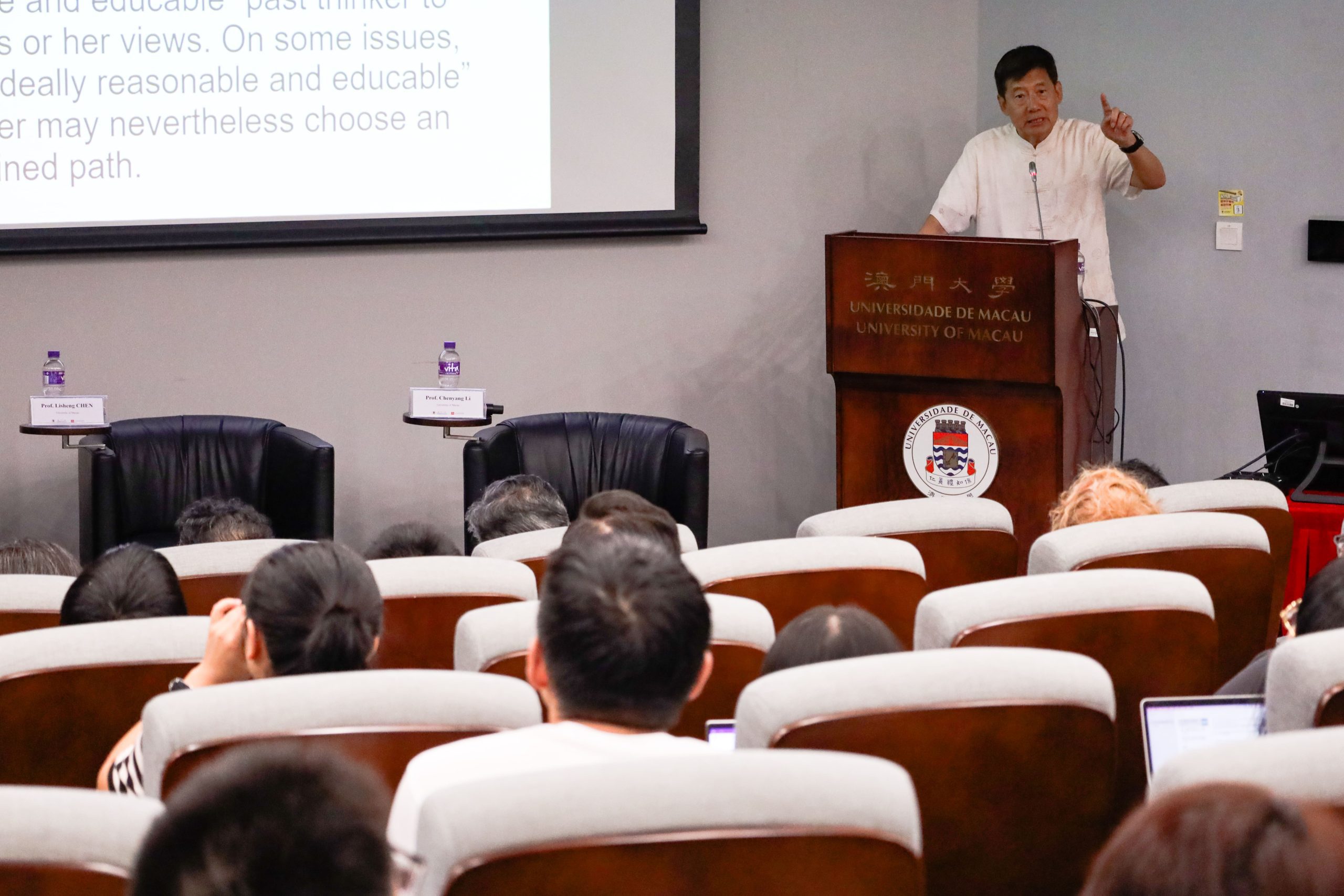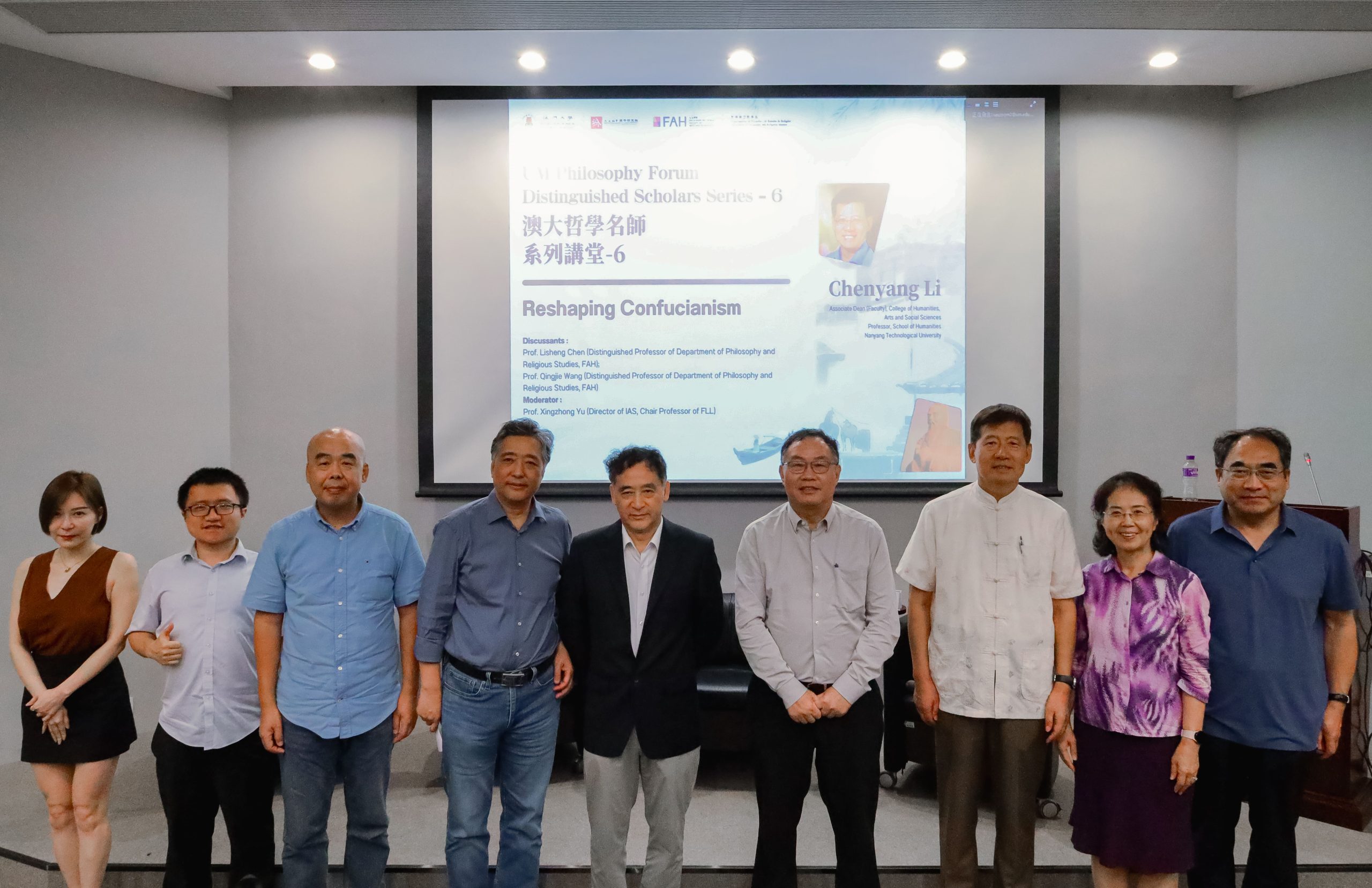 The UM Philosophy Forum Distinguished Scholars Series 6, co-organized by the Institute of Advanced Studies in Humanities and Social Sciences (IAS) and the Department of Philosophy and Religious Studies of the Faculty of Arts and Humanities (FAH), was successfully held on 23 September, at the Lecture Hall in Cultural Building. Professor Chenyang Li from Nanyang Technological University delivered a wonderful speech on “Reshaping Confucianism”. Professor Lisheng Chen and Professor Qingjie Wang from the Department of Philosophy and Religious Studies, FAH, were invited as the discussants, and Professor Xingzhong Yu, Director of IAS and Chair Professor of FLL was invited as the moderator.