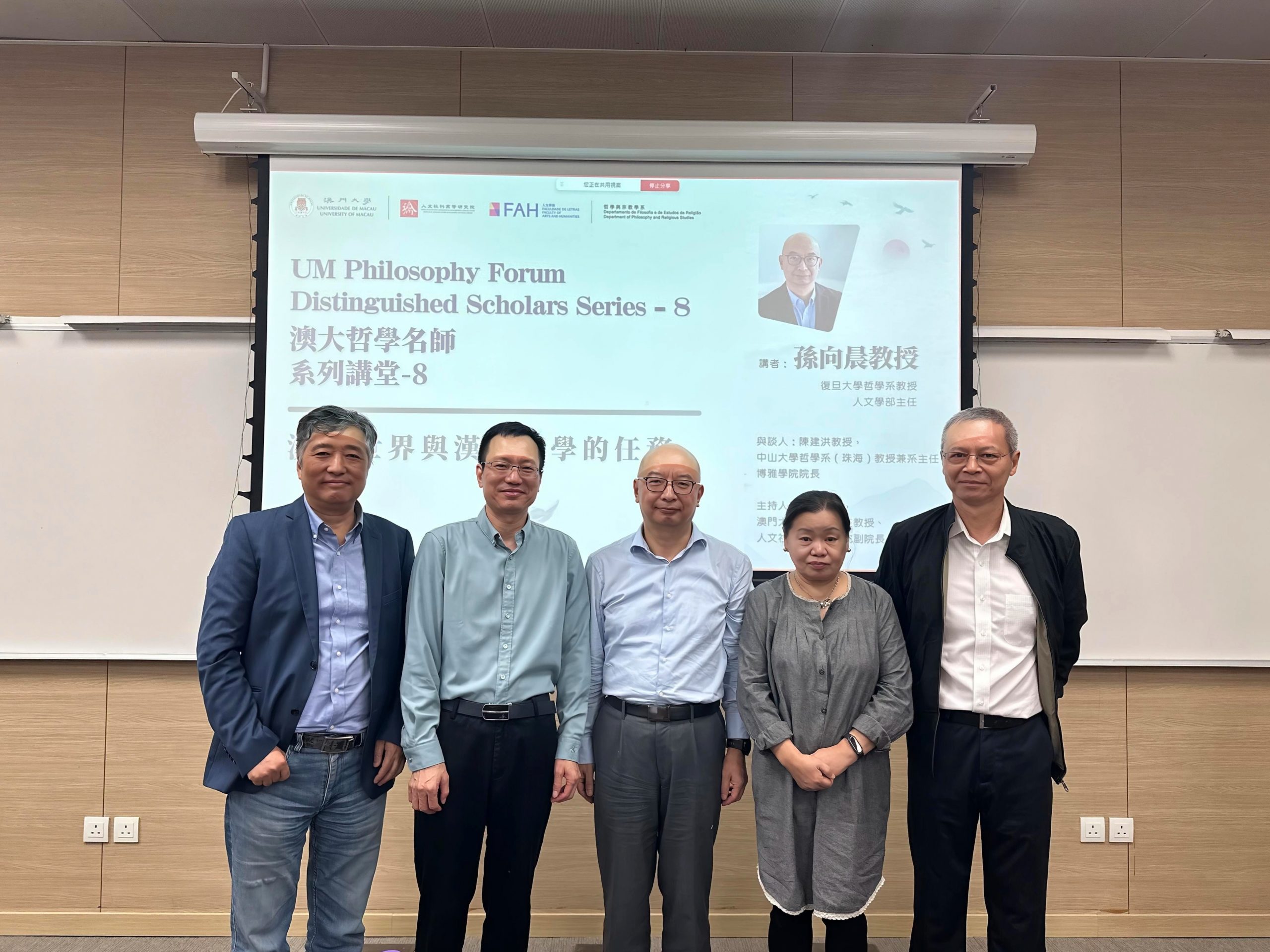UM Philosophy Forum Distinguished Scholars Series – 8, jointly organised by the Institute of Advanced Studies in Humanities and Social Sciences (IAS) and the Department of Philosophy and Religious Studies of the Faculty of Arts and Humanities (FAH) at the University of Macau, was successfully held on the afternoon of 24 October 2025 at the Faculty of Arts and Humanities Building (E21A-G049). The lecture featured Professor Xiangchen Sun, Professor of Philosophy and Dean of the Division of Humanities at Fudan University, as the keynote speaker. The session was moderated by Professor Di Wang, Associate Director of IAS and Chair Professor of the Department of History at UM, with Professor Jianhong Chen, Chair of the Department of Philosophy (Zhuhai) and Dean of the School of Liberal Arts at Sun Yat-sen University, serving as discussant.